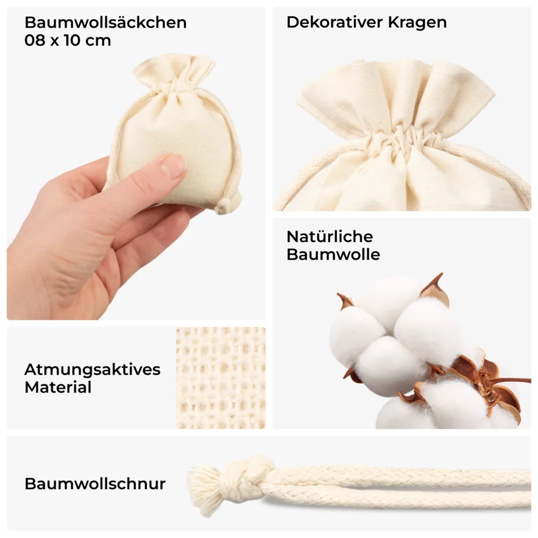 Diese Säckchen eignen sich perfekt als Geschenkverpackung, dienen aber auch als Verpackung für Kosmetikprodukte, Schmuck oder Kerzen. Baumwollsäckchen werden auch gerne von Unternehmen verwendet, die nach origineller Verpackung für Werbegeschenke suchen.