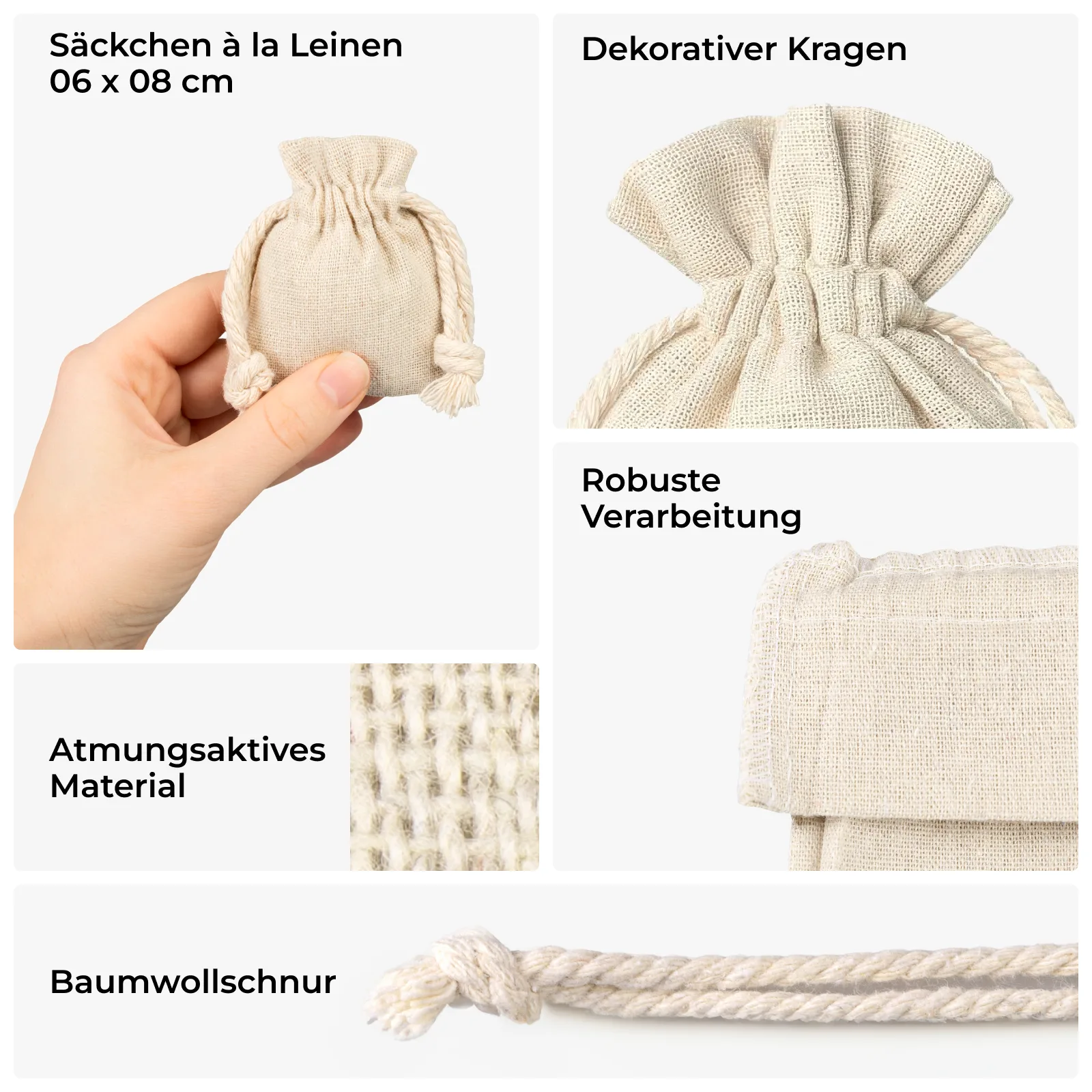Entdecken Sie die strapazierfähigen und praktischen Stoffsäckchen in naturleinen Farbe. Die hier vorgestellten kleinen Säckchen haben die Maße 6 x 8 cm. Das Paket enthält ein Set mit 10 Stück Universalsäckchen.