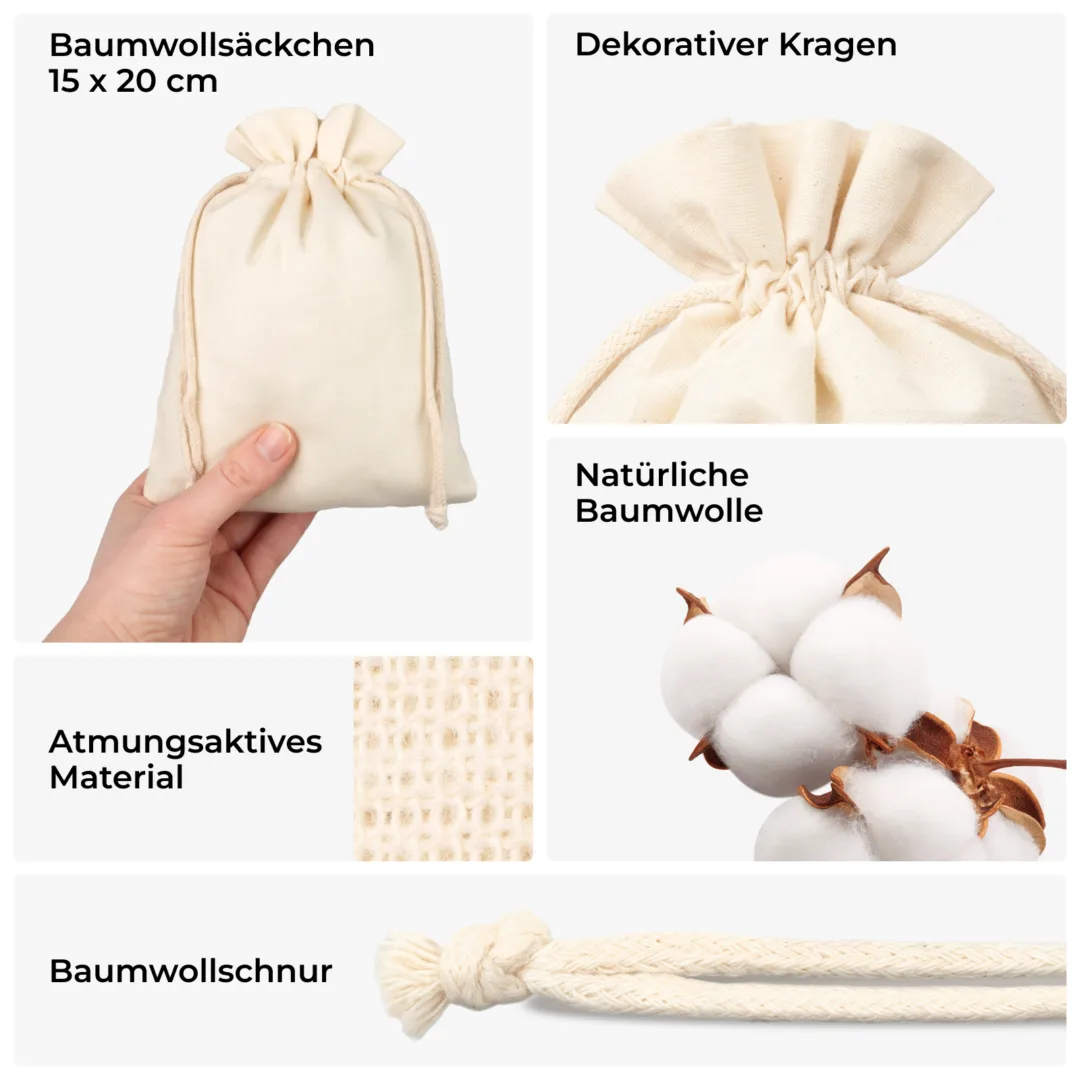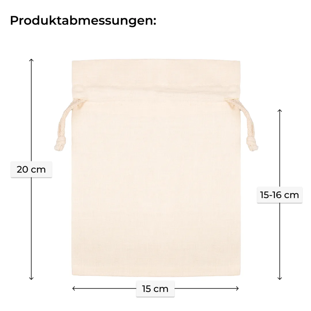 Ein haltbarer und praktischer Baumwollbeutel mit den Abmessungen 15 x 20 cm, lässt sich mit einer natürlichen Kordel zusammenziehen.