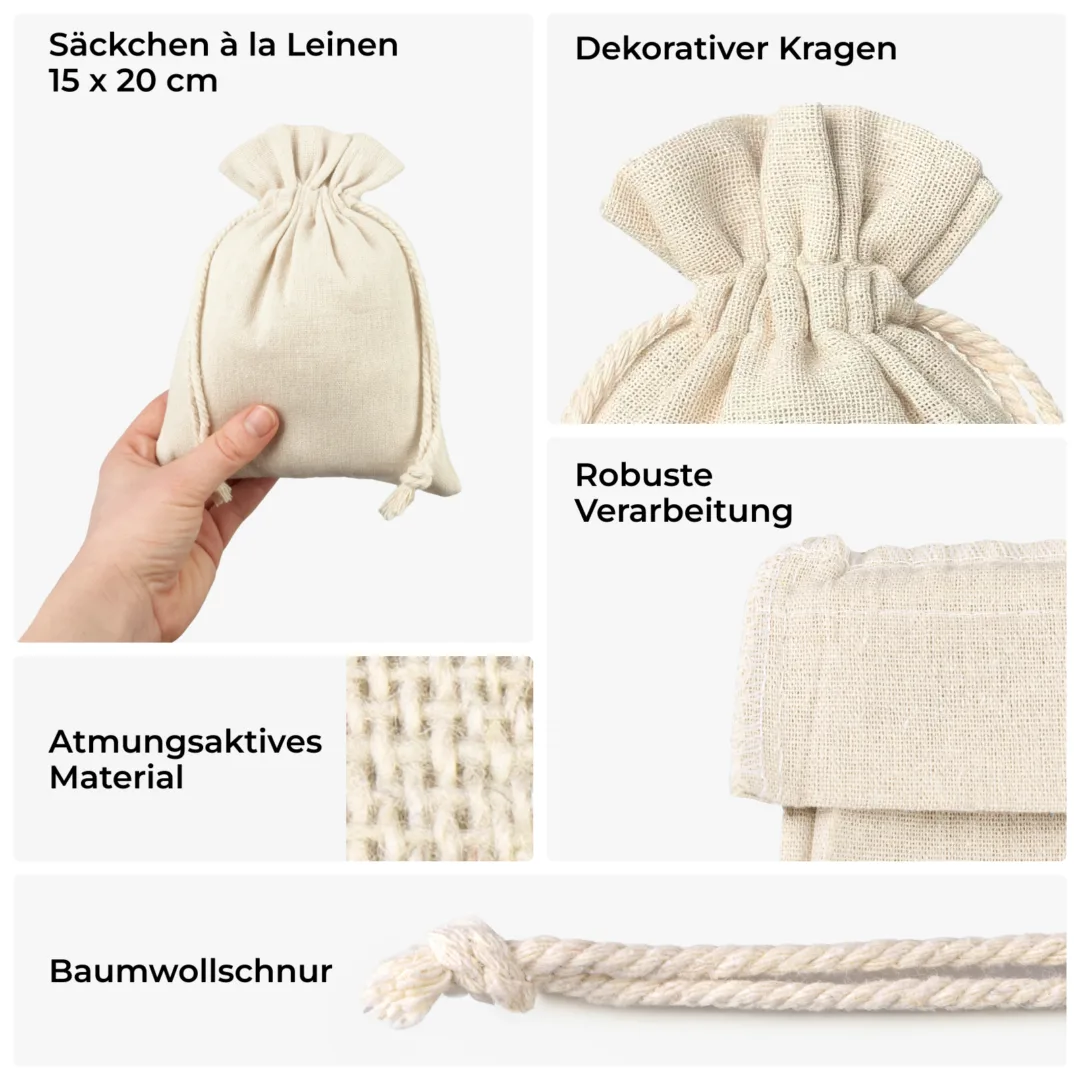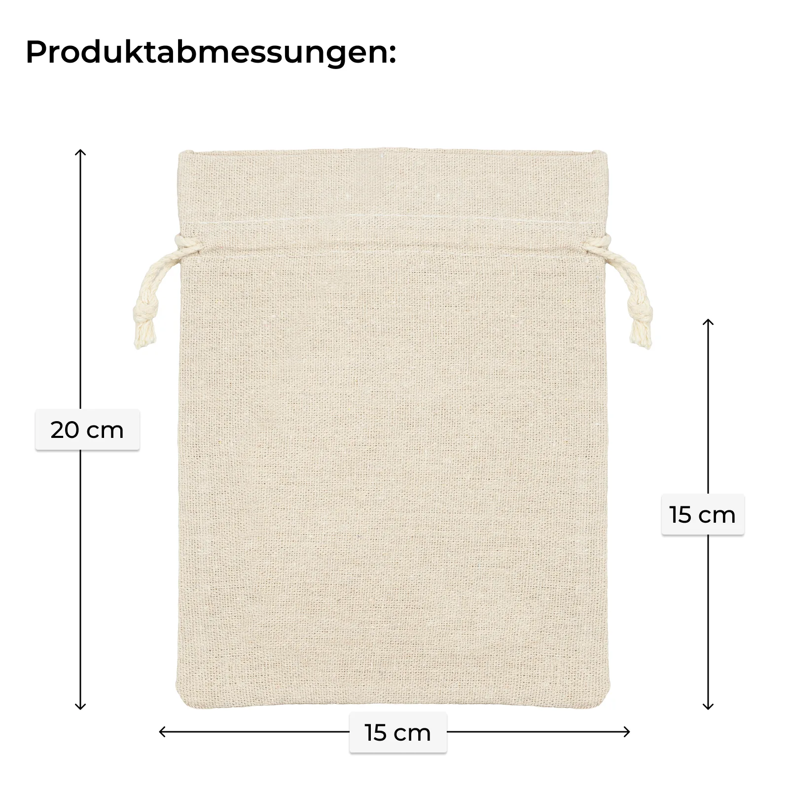 Entdecken Sie die strapazierfähigen und praktischen Stoffsäckchen in naturleinen Farbe. Die hier vorgestellten kleinen Säckchen haben die Maße 15 × 20 cm. Das Paket enthält ein Set mit 5 Stück Universalsäckchen.