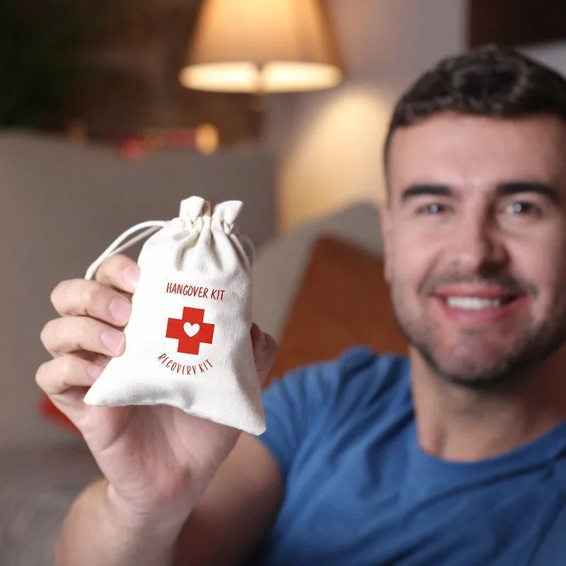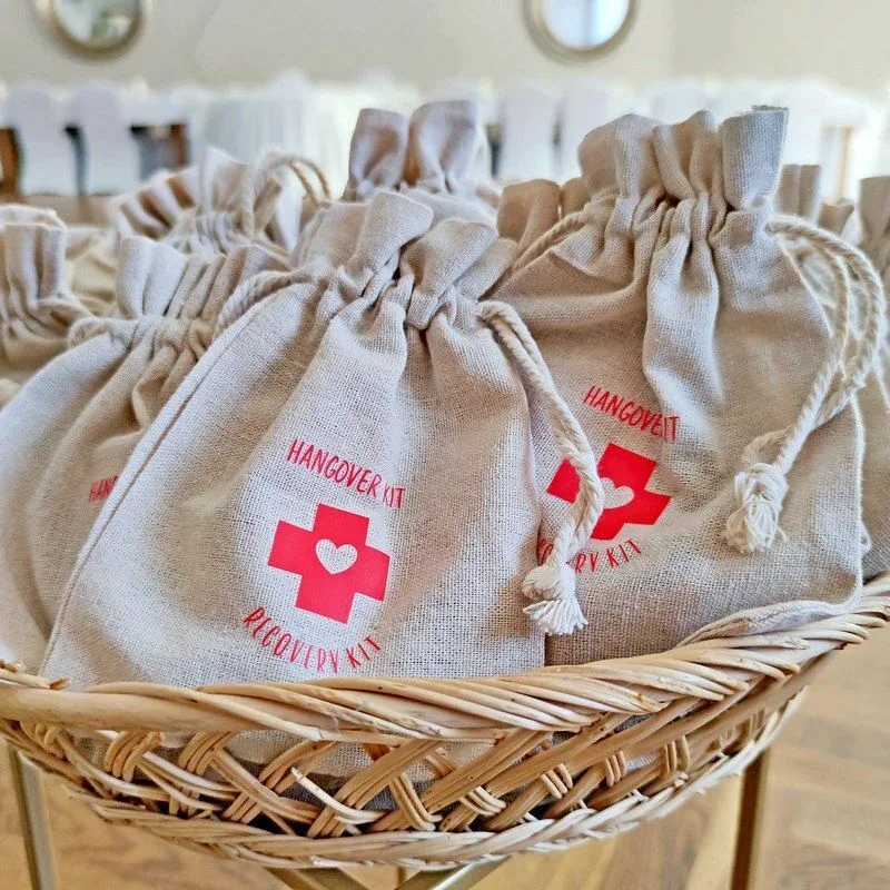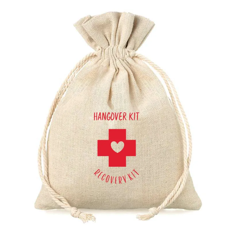 Hier können Sie ein Set aus 5 Stück geräumiger Beutel in Leinenoptik mit dem Aufdruck „Hangover Kit“ bestellen – zum individuellen Befüllen (ohne Inhalt). Die Beutel können zum Beispiel mit einem süßen Snack, Pflastern, einem isotonischen Getränk, Kaugummi, einem Kaffeebeutel, Elektrolyten, Vitaminen oder einer Kopfschmerztablette bestückt werden. Eine originelle und zugleich praktische Geschenkidee, die Ihre Gäste überraschen und amüsieren wird!