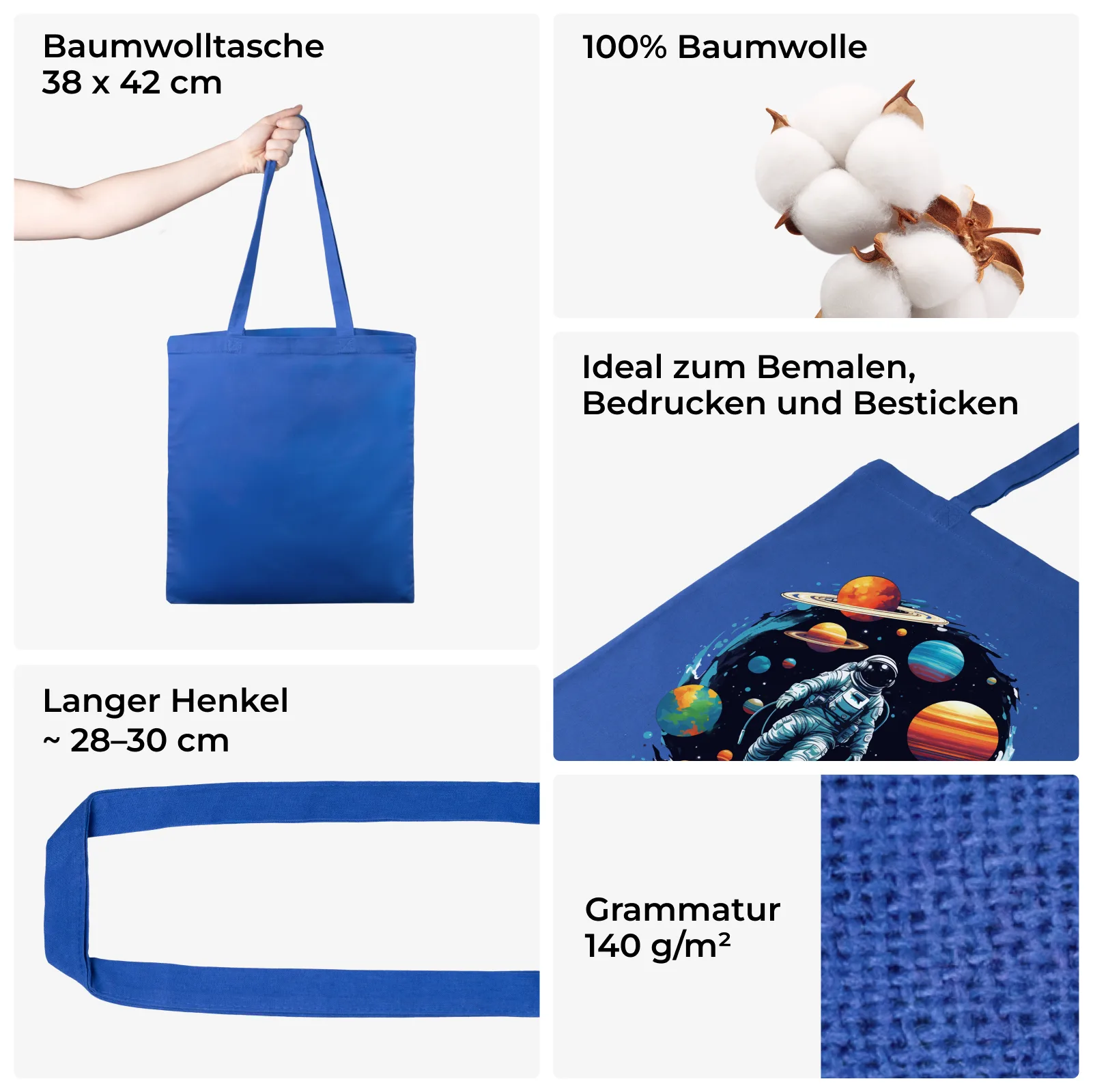 Ihre große, blaue Beutel aus Baumwolle können Sie in verschiedensten Situationen nutzen! Sie können damit auf dem Markt einkaufen gehen oder auch zur Aufbewahrung von Gegenständen nutzen. Verpacken Sie Aufmerksamkeiten für Ihre Nächsten, Ihre Produke oder oder Marketingartikel damit ein.
