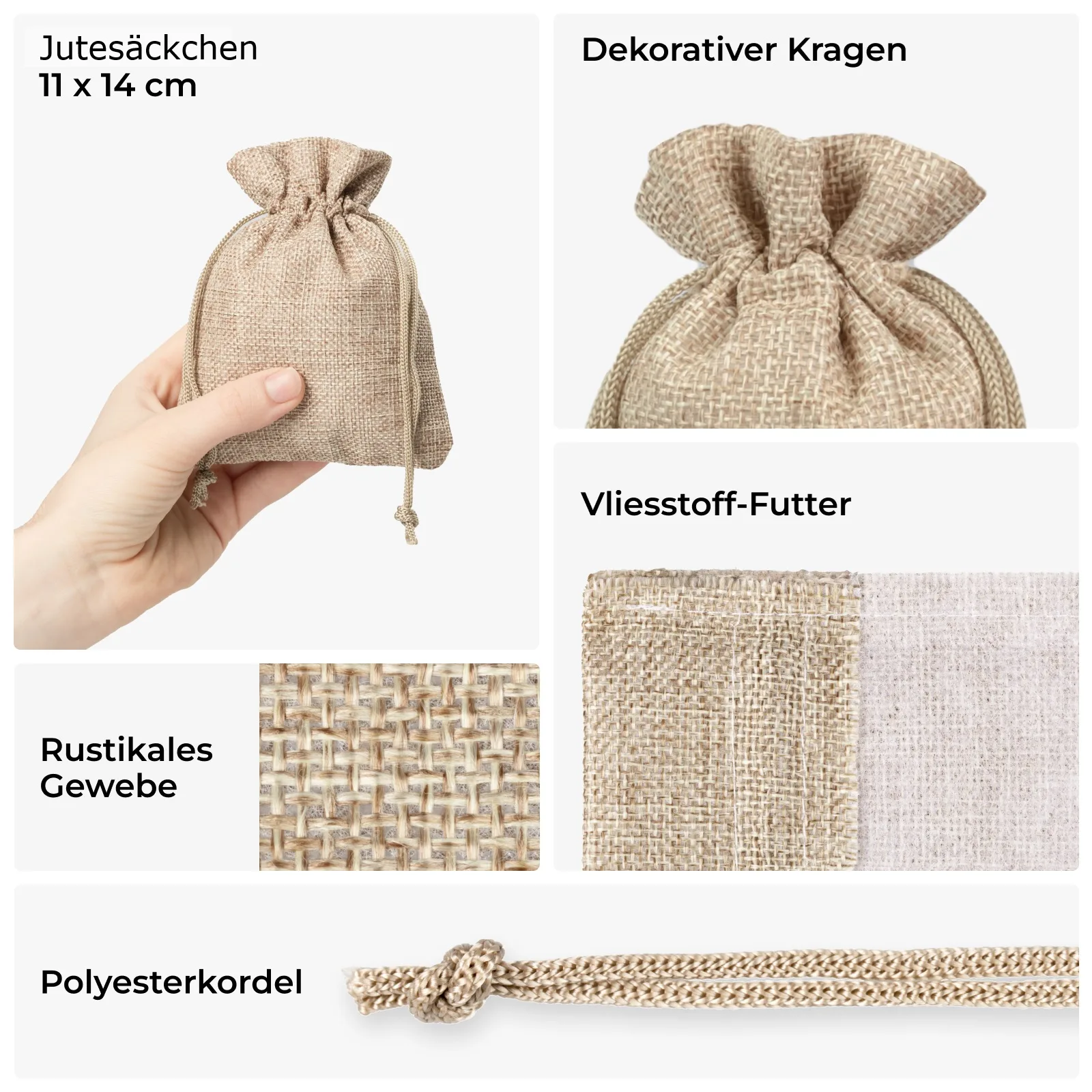 Der angebotene Beutel-Set besteht aus 10 Stück. Diese Stückzahl wird sicher für eine lange Zeit reichen. Beutelchen aus Jute, die Sie in unserem Angebot finden, sind aus der künstlichen Jute gefertigt. Beide Stoffe sind sehr robust und sind aus groben, schnurartigen Fäden gewebt. Sie absorbieren Feuchtigkeit und geben sie dann ab, daher können sie ohne Probleme dort eingesetzt werden, wo die Temperaturen sehr stark zwischen Tag und Nacht schwanken.