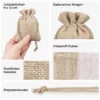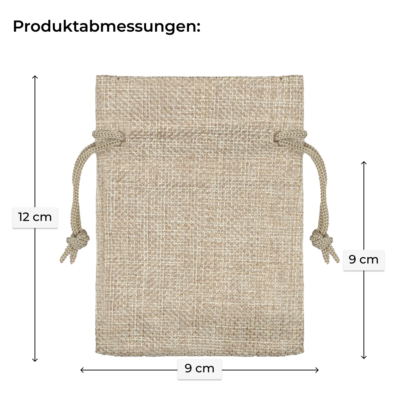 Kleine, vielseitig einsetzbare Jutebeutel in Farbe Naturfarbe und einer Größe von ca. 9 cm x 12 cm.