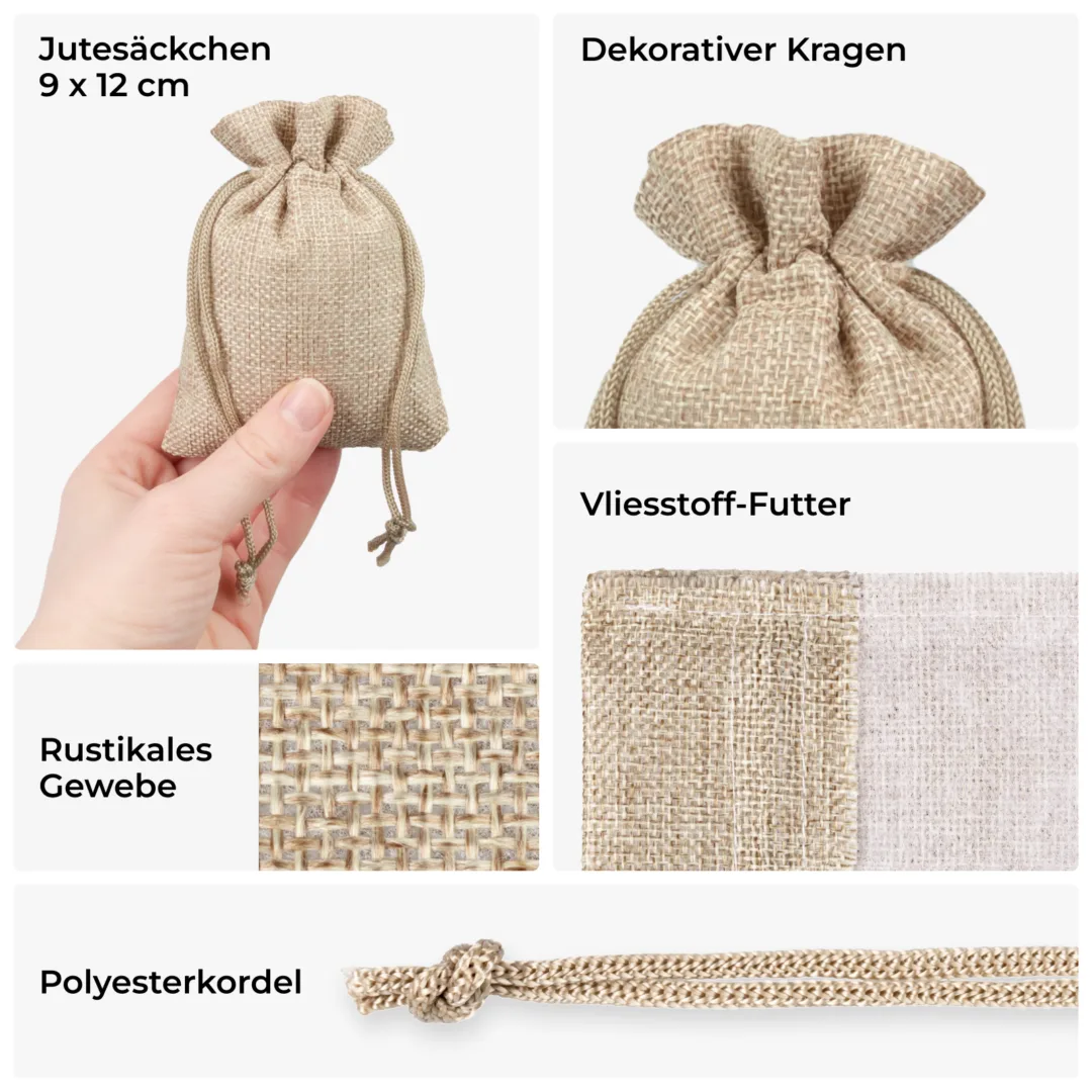 Der angebotene Beutel-Set besteht aus 10 Stück. Diese Stückzahl wird sicher für eine lange Zeit reichen. Beutelchen aus Jute, die Sie in unserem Angebot finden, sind aus der künstlichen Jute gefertigt. Beide Stoffe sind sehr robust und sind aus groben, schnurartigen Fäden gewebt. Sie absorbieren Feuchtigkeit und geben sie dann ab, daher können sie ohne Probleme dort eingesetzt werden, wo die Temperaturen sehr stark zwischen Tag und Nacht schwanken.