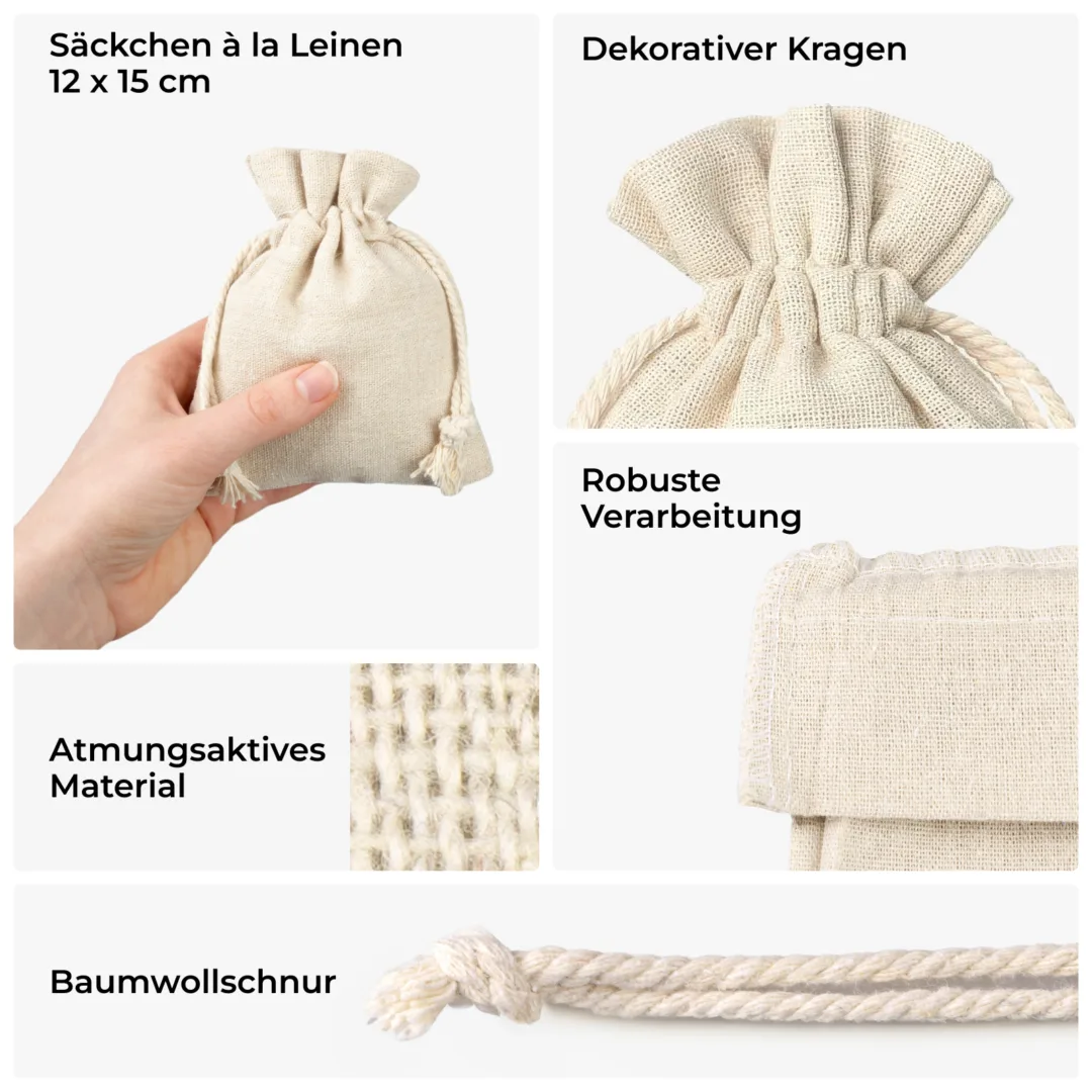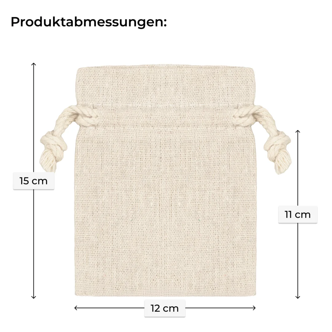 Entdecken Sie die strapazierfähigen und praktischen Stoffsäckchen in naturleinen Farbe. Die hier vorgestellten kleinen Säckchen haben die Maße 12 × 15 cm. Das Paket enthält ein Set mit 10 Stück Universalsäckchen.
