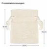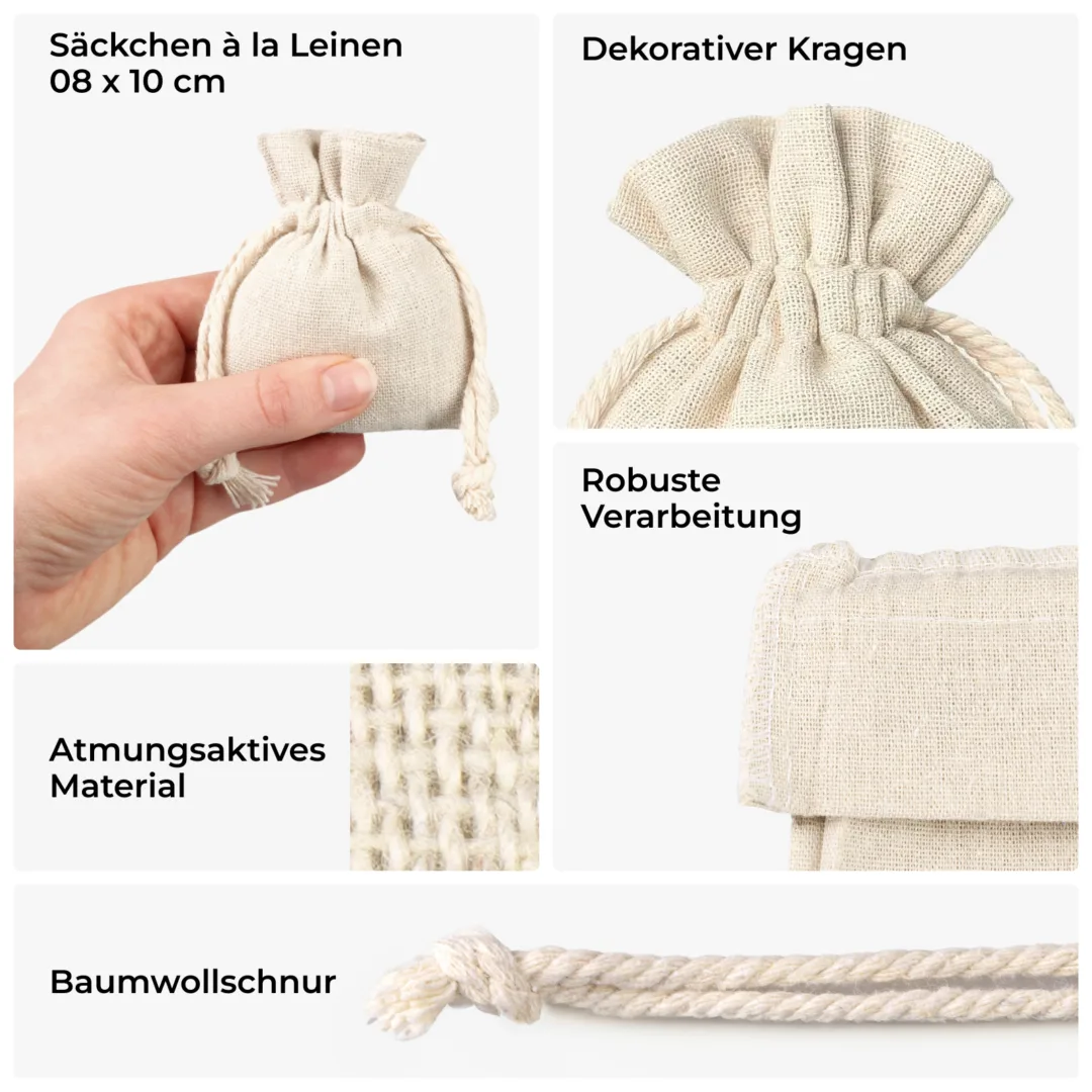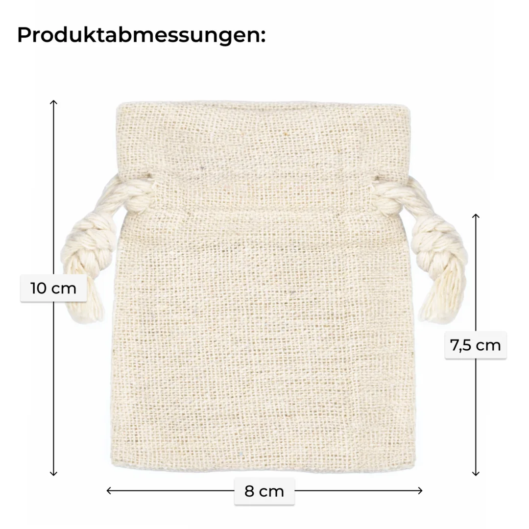Unser Beutel misst ca. 8 cm x 10 cm und ist mit einem praktischen Kordelzug ausgestattet. Das Material im Linen-Look vereint robustes Design mit natürlichem Charme und macht den Beutel vielseitig einsetzbar.