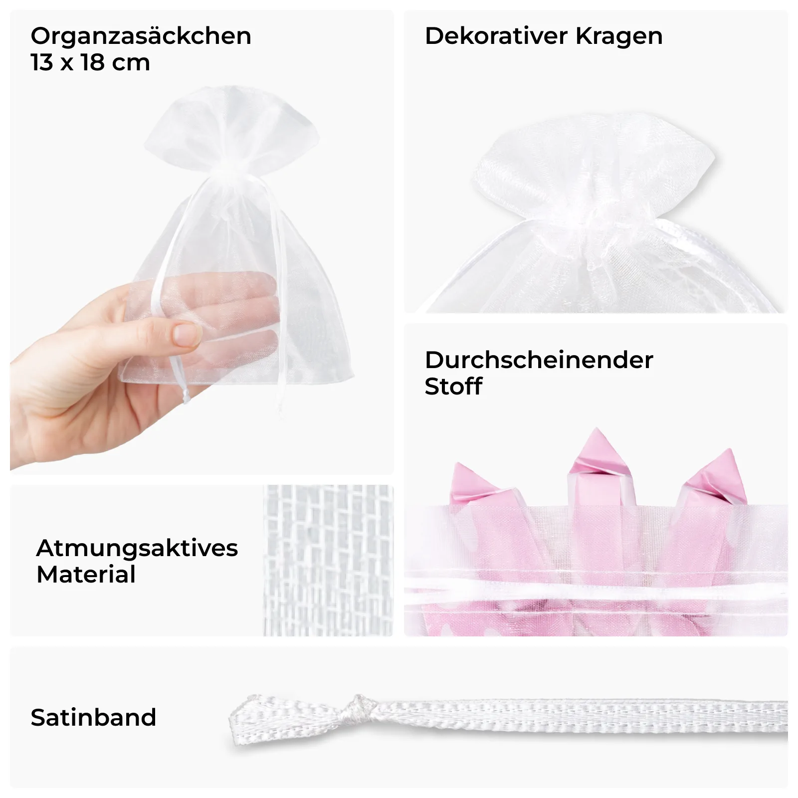 Organza ist ein transparenter, glänzender Stoff, der früher ausschließlich aus Seide hergestellt wurde und daher ein Luxusgut war. Dank günstigerer und strapazierfähigerer synthetischer Materialien sind Organzasäckchen heute weit verbreitet und finden viele kreative Anwendungen.