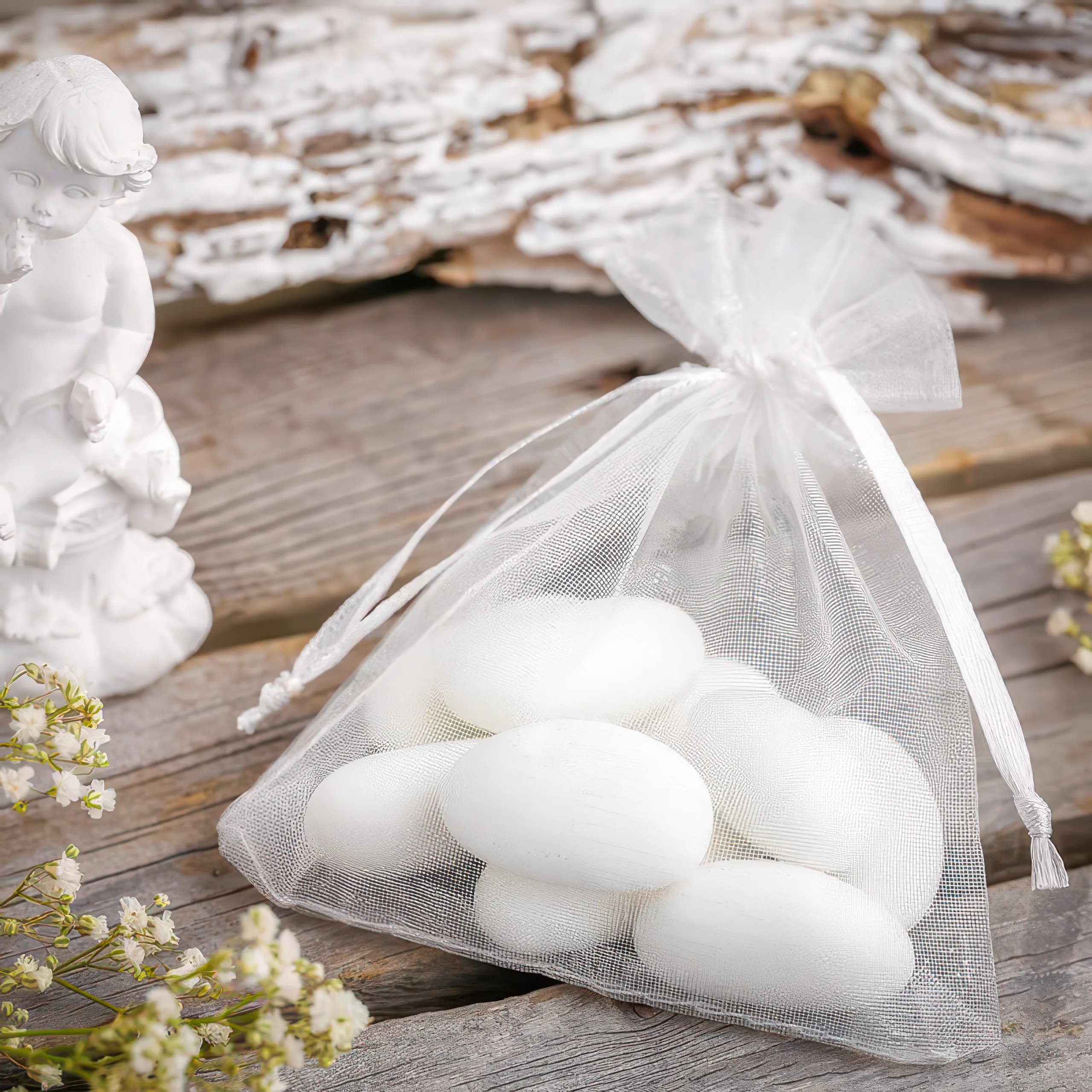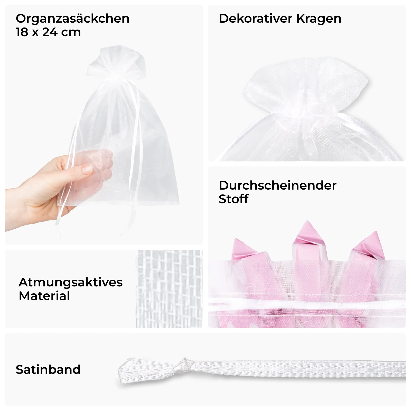 Das Set enthält 10 Stück Organzasäckchen, jeweils 18 x 24 cm groß, in weißer Farbe. Weiße Beutel sind vielseitige Produkte, die verwendet werden können, um verschiedene Gegenstände zu präsentieren. Sie eignen sich hervorragend als transparente Verpackung für Schmuck, handgemachte Seifen, Schreibwaren, Souvenirfiguren, Werbegeschenke oder Proben von Kosmetika und Parfüms. Aufgrund ihrer zarten Farbe werden weiße Organzabeutel auch häufig für die Vorbereitung kleiner Geschenke für Hochzeits- oder Kommunionsgäste verwendet.