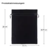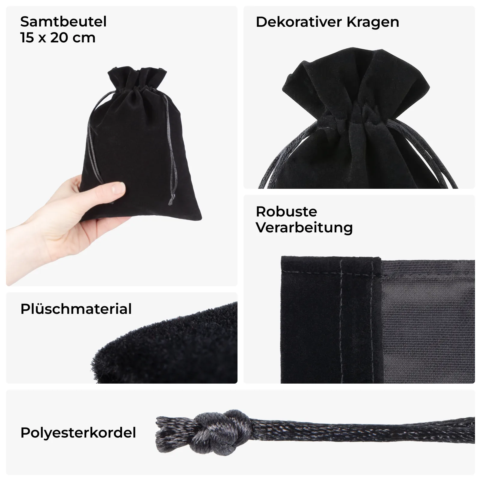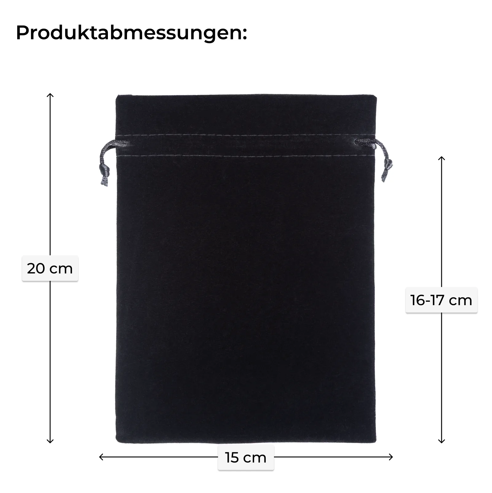 Das Set enthält 5 Stück schwarze Samtbeutel in der Größe 15 x 20 cm. Suchen Sie nach einer anderen Farbe oder Größe? Schauen Sie sich die gesamte Kollektion von Samtbeuteln in unserem Geschäft an!